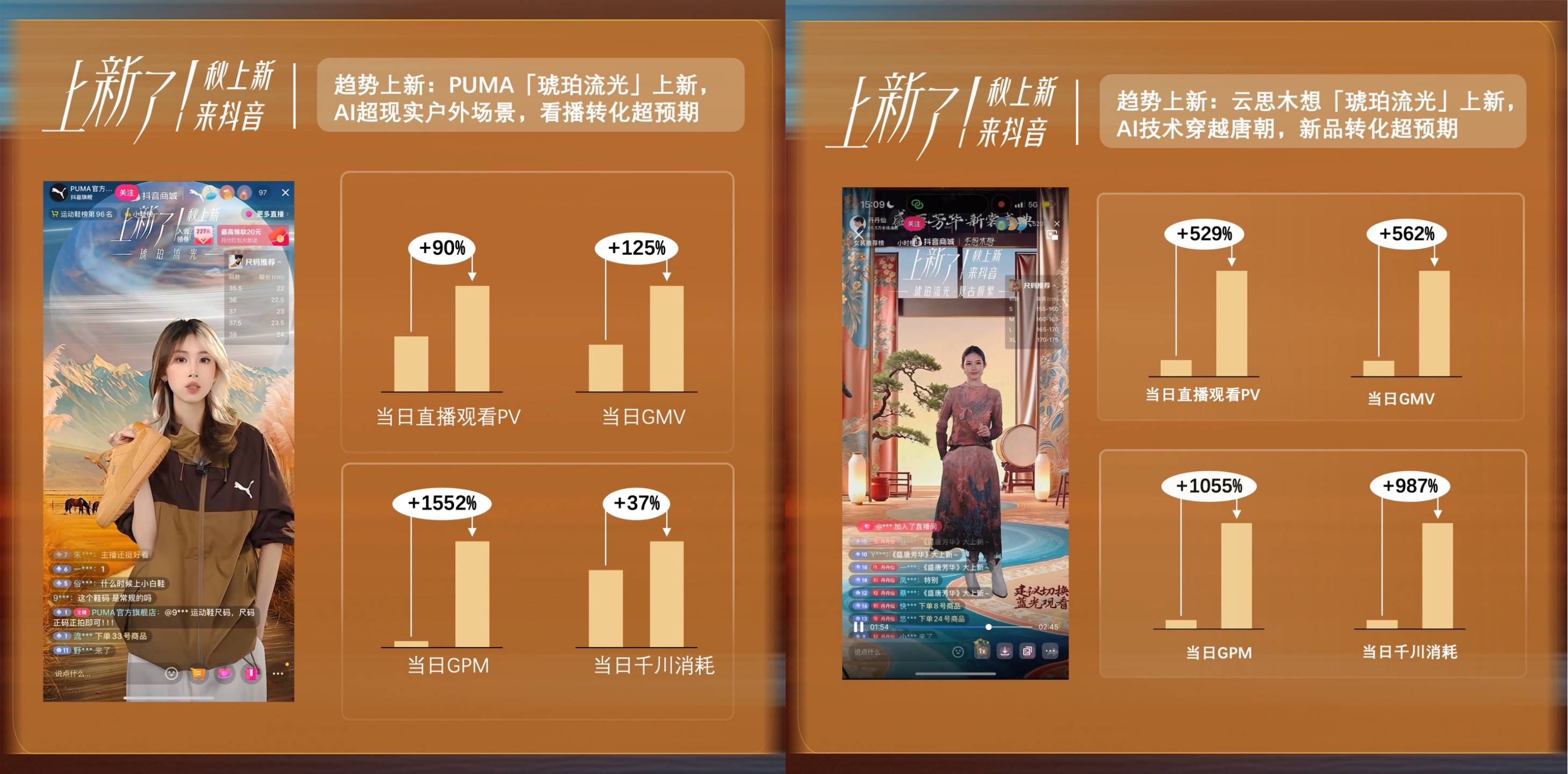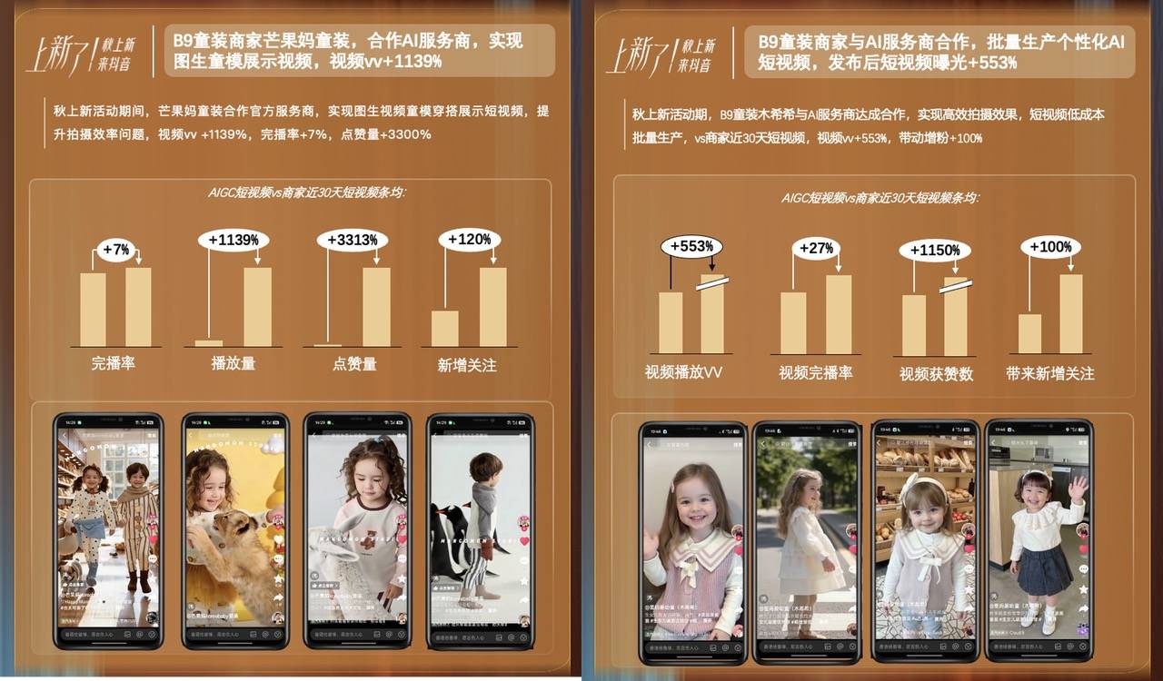 抖音商城「秋上新」还挖掘多个AI服务商,提供更个性化的AI制作服务,帮助商家批量生成优质素材。其中AI挂车短视频效率更好,日均播放量增长465%,日均GMV接近翻倍,关注次数增长606%。