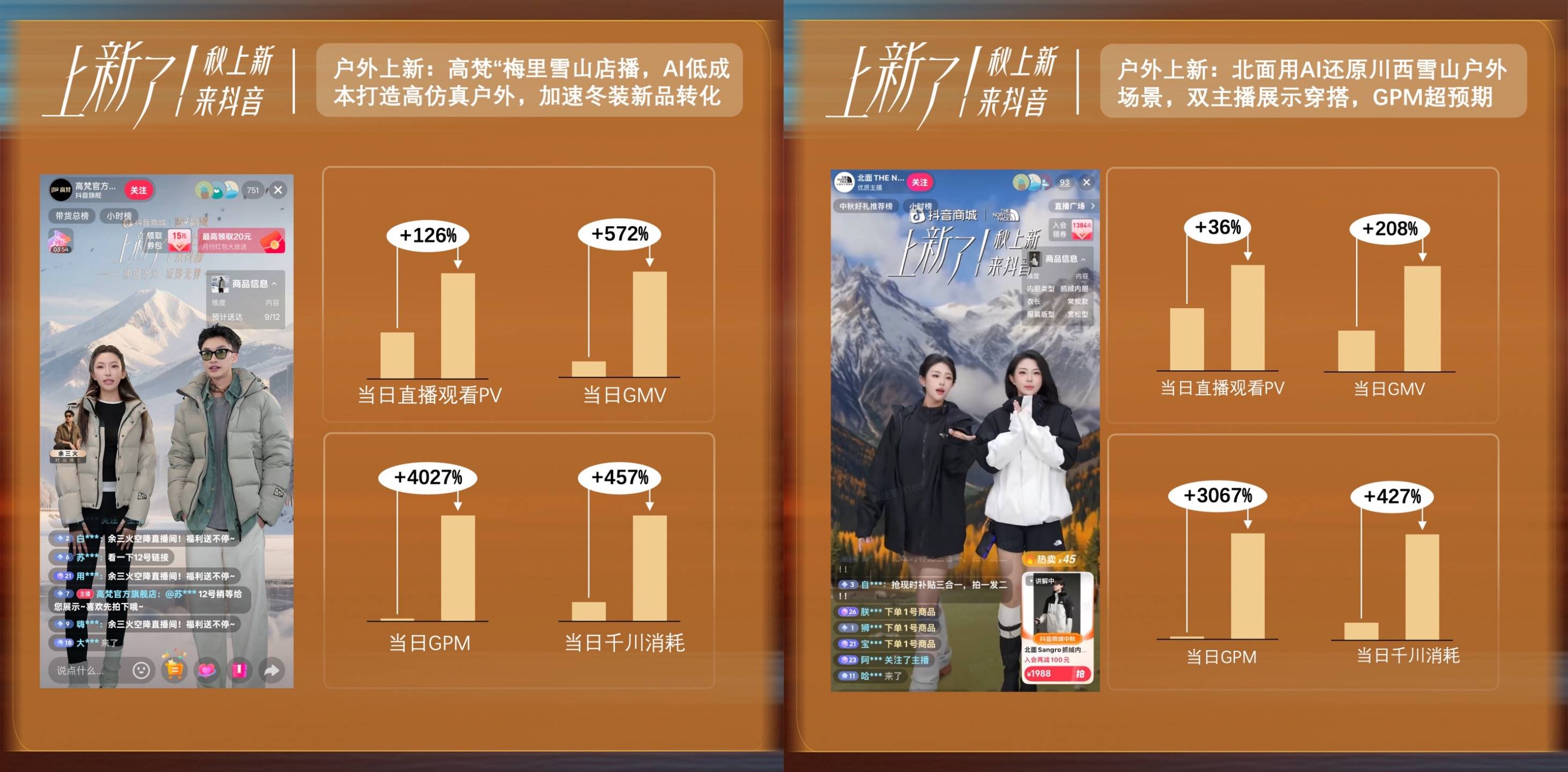 · 户外上新:AIGC助力低成本打造高仿真户外,多种户外场景直播呈现。高梵、北面分别在靠梅里雪山、川西雪山AI户外置景拉动GMV与GPM成本增长,加速冬装新品转化。