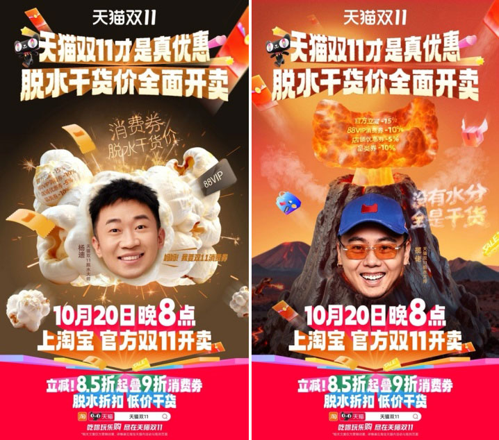 在短视频之外,配套平面创意进一步强化视觉认知。达人化身火山、海绵、干燥剂等“脱水神器”,以符号化视觉语言加深用户对“脱水价”的理解。通过“短视频+平面”双维度内容布局,“天猫双11脱水价”在快手平台实现广泛传播。