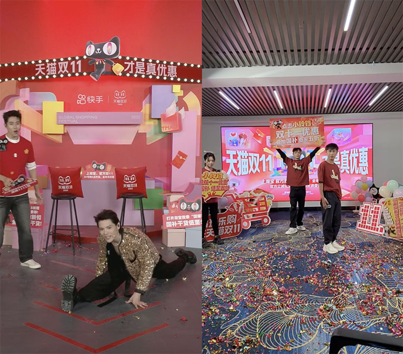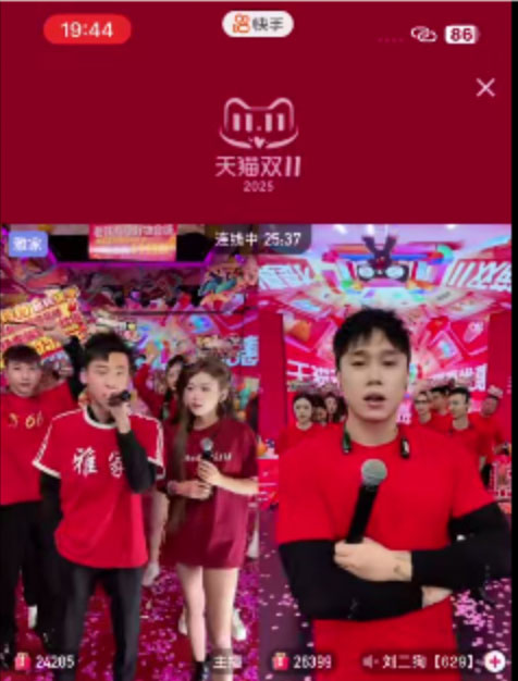 10月31日,快手达人博雅与刘二狗分别带领家族团队,展开了一场“天猫双11补贴掌门人”PK直播。双方围绕“降温上淘宝双11”的核心利益点,在才艺表演、游戏互动等环节中,巧妙传递“官方立减8.5折”“老铁专属降温红包”等优惠信息。