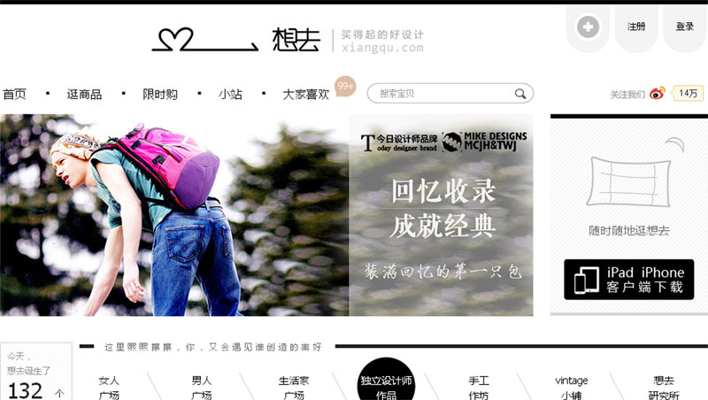 从用户定位上来看,想去没有大野心,只准备抓住其体量有限的目标群体。“我们的用户要比美丽说、蘑菇街小众很多。他们通常想去运营从事艺术相关行业;经济实力偏中高端、有一定消费能力;有情调,购物较挑剔;女性居多,占60%以上。”想去运营负责人原野向亿邦动力网勾勒了其用户的大致特点。目前,想去PC端注册用户有30多万,每日UV十多万。
