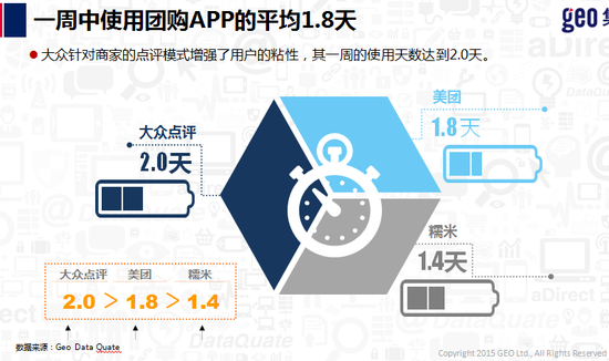 国内大数据机构GEO在2015年1月份做了一份《团购O2O移动应用洞察报告》,报告调查了华北和华东地区的约1亿移动互联网用户。数据显示,用户平均每天停留在团购App的时间仅10分钟左右,在每天的使用时长上,大众点评稍高于美团和糯米。